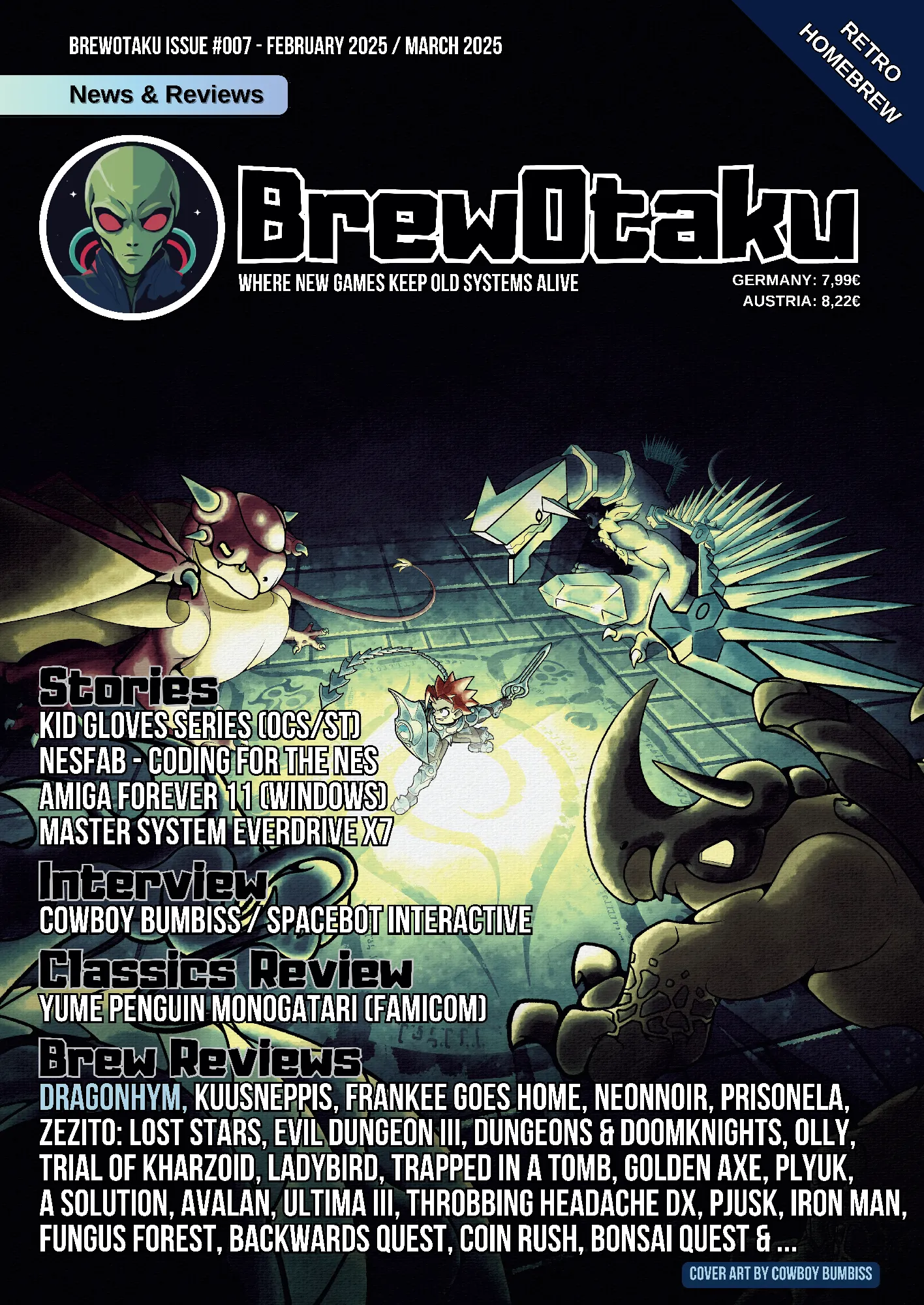 The 7th printed issue of BrewOtaku, a magazine specializing in new game releases for retro systems. 88 pages full of new games for your favourite classic console or computer!