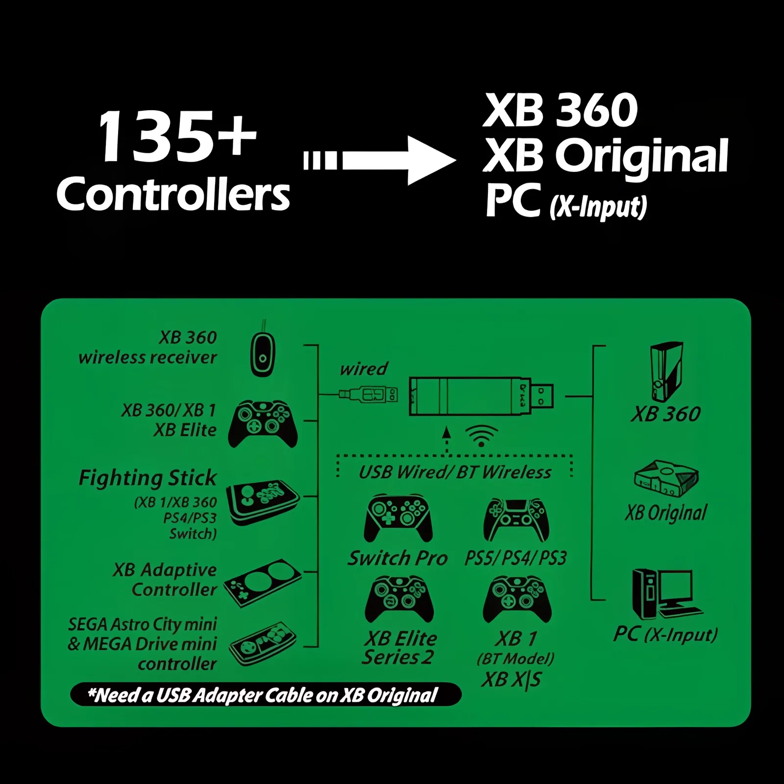 The Wingman XB2 let you play original XBox and XBox360 games with more than 125 different wired and wireless controllers, includes XSX/Xbox One/Elite2/PS5/PS4/PS3/Switch official and licensed controllers. If you own a more recent XBox, you need to use the Wingman XB3.